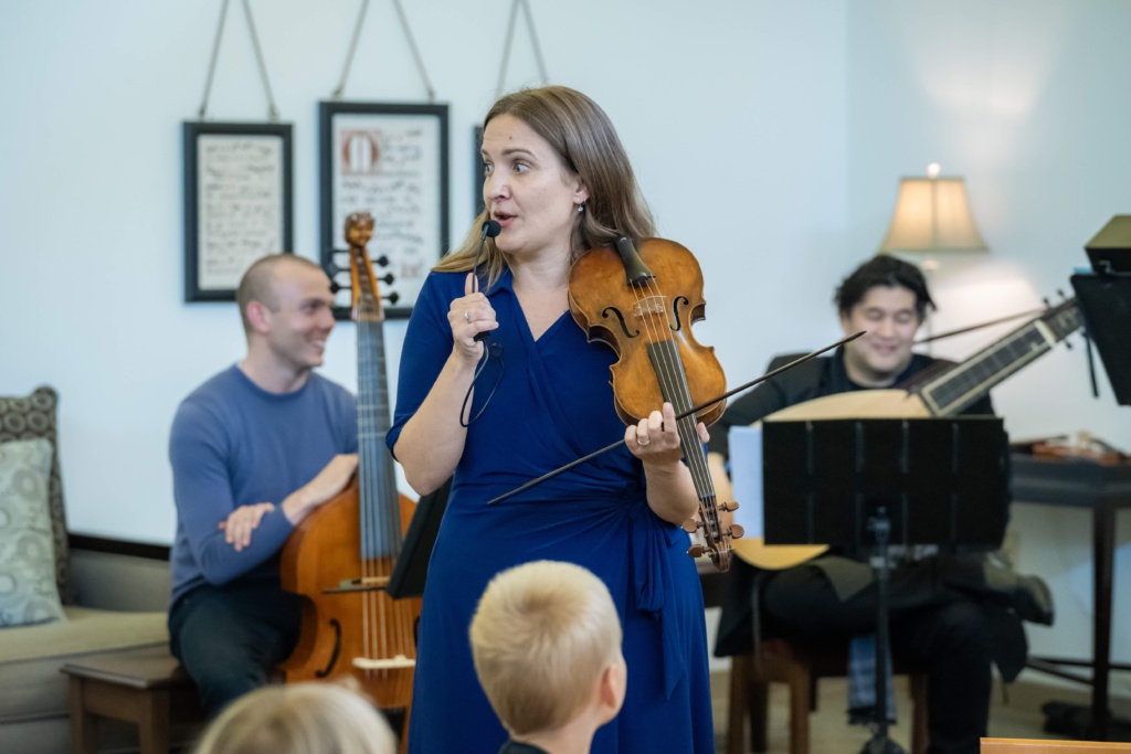 Led by Lindsey Strand-Polyak on the campus of Festival venue-partner St. Michael & All Angels to launch our education program at the start of 2025-2026, families from across Orange County and beyond enjoyed a relaxed 50-minute “non-cert” for young people ages 0-18 and their accompanying parents/guardians. With musical storytelling; themed coloring sheets for kids, teens and adults to fill in while listening; a coloring contest; baroque instrument petting zoo; snacks on the patio; and lots of Baroque music discovery, a fun and rewarding time was had by all.